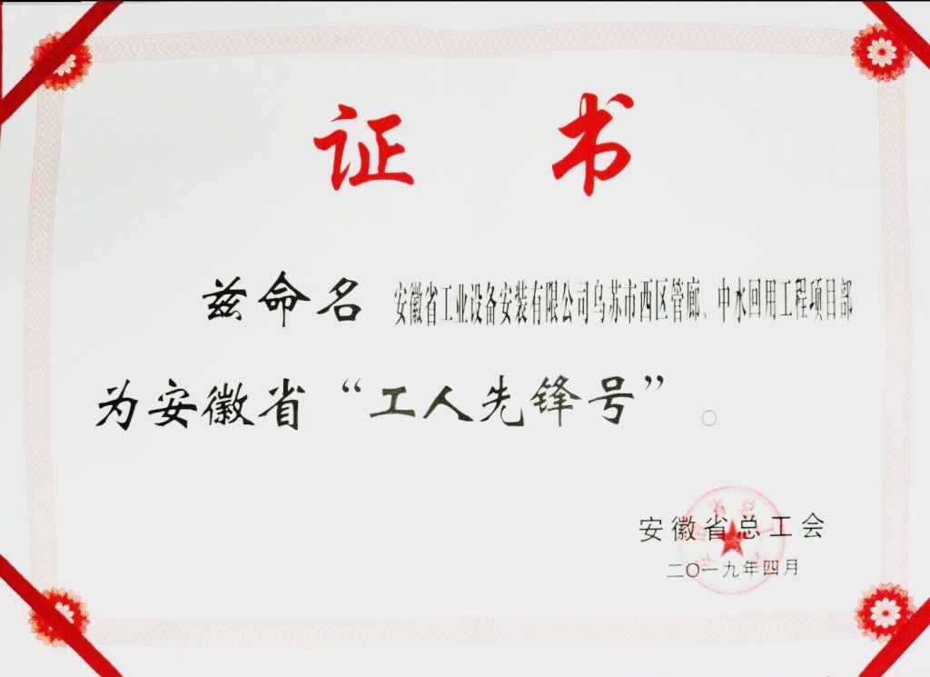 安徽安裝新疆烏蘇管廊、中水項目部榮獲“安徽省工人先鋒號”稱號
