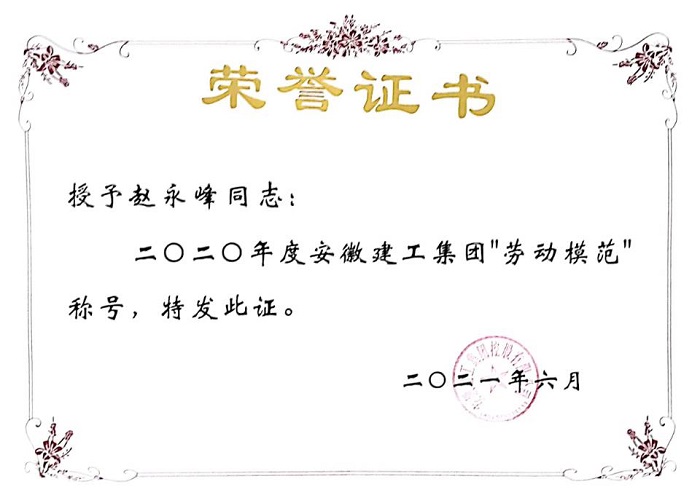 2019年3月,根據安徽安裝公司拓展市場、加快發展的工作要求,趙永峰勇挑重擔,擔負起了合肥分公司“開拓市場一片天”的重任,團結帶領分公司班子成員和全體員工立足新起點、整裝再出發,努力為實現分公司新一輪大發展而不懈奮斗,取得的可喜成績得到了領導和員工們的一致認可和稱贊。受到安徽建工集團及安徽省工業設備安裝有限公司的表彰,在2021年7月1日-2日召開的安徽建工集團控股有限公司二屆一次職工代表大會暨“七一”表彰會上,趙永峰同志作為集團勞動模范代表光榮的上臺授獎。