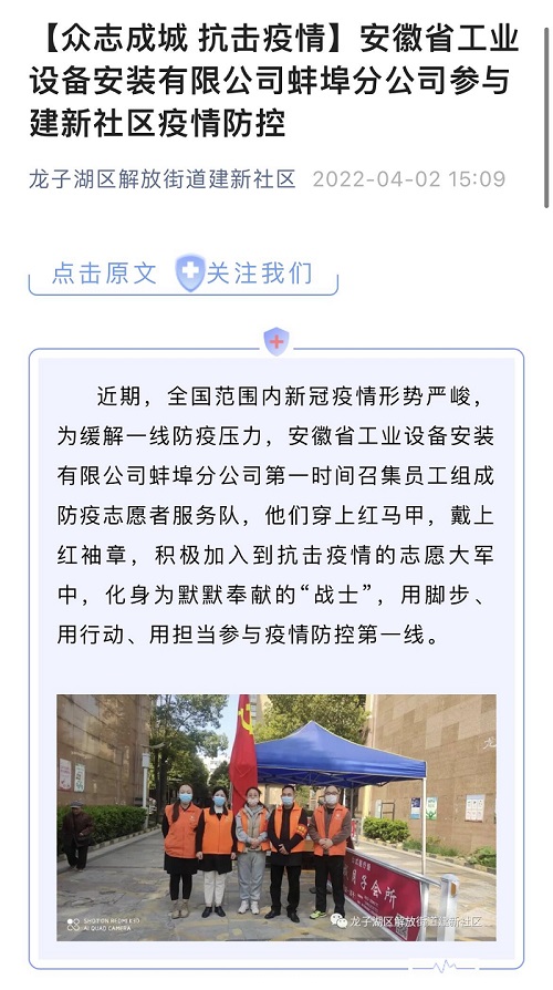 通過本次活動,志愿者們用實際行動踐行了初心和使命,展現了安徽安裝志愿者飽滿的精神風貌。建新社區黨委表達了對于安徽安裝公司的真誠感謝,期間社區及時通過微信公眾號對安徽安裝積極擔當社會責任予以報道,有效擴大了企業影響力,樹立了良好企業形象。