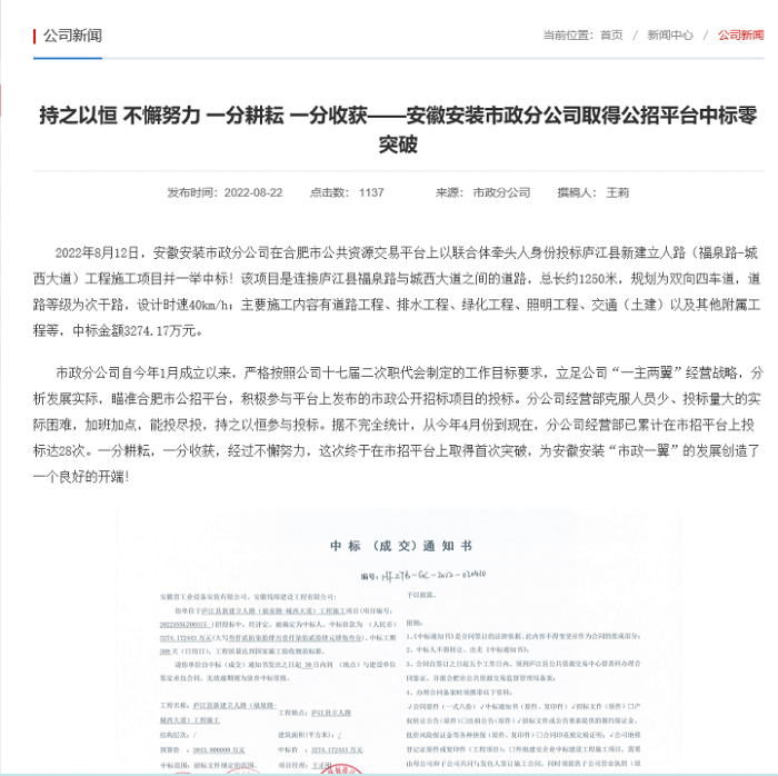 開拓市場取得突破。今年以來,分公司積極采取參與集團內部產業(yè)鏈專業(yè)分包競標和外部公招項目投標雙向并舉的方式拓展市場,打開經營局面,連續(xù)承接了蜀山區(qū)體育公園項目安裝工程等多個項目。同時積極參與合肥市公招平臺投標,8月份一舉中標廬江縣新建立人路(福泉路-城西大道)工程施工項目,中標金額3274.17萬元,取得公招投標零的突破。