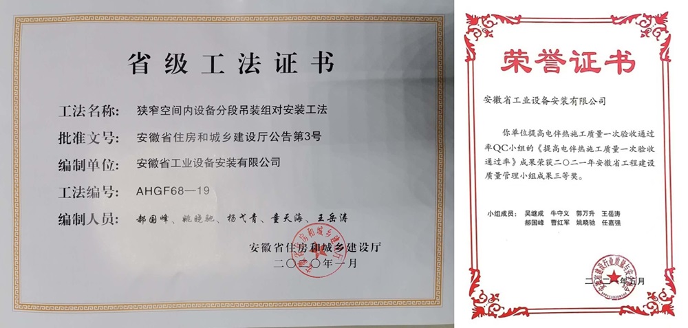 在繁忙的工作之余,姚曉馳對(duì)專(zhuān)業(yè)知識(shí)的探索與熱愛(ài)從未有片刻停歇。他仿若一位求知若渴的行者,積極主動(dòng)地在知識(shí)的海洋中破浪前行,持續(xù)拓寬并深化自身的知識(shí)體系。他參與研發(fā)的《狹窄空間內(nèi)設(shè)備分段吊裝組對(duì)安裝工法》成功榮獲安徽省住房和城鄉(xiāng)建設(shè)廳頒發(fā)的省級(jí)工法稱(chēng)號(hào),《提高電伴熱施工質(zhì)量一次驗(yàn)收通過(guò)率》也榮獲了安徽省工程建設(shè)質(zhì)量管理小組成果三等獎(jiǎng)。